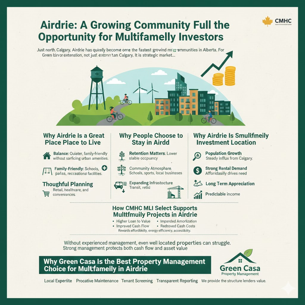 When combined with the advantages of CMHC MLI Select financing and the expertise of Green Casa Property Management, investing in Airdrie becomes a strategic and sustainable decision.