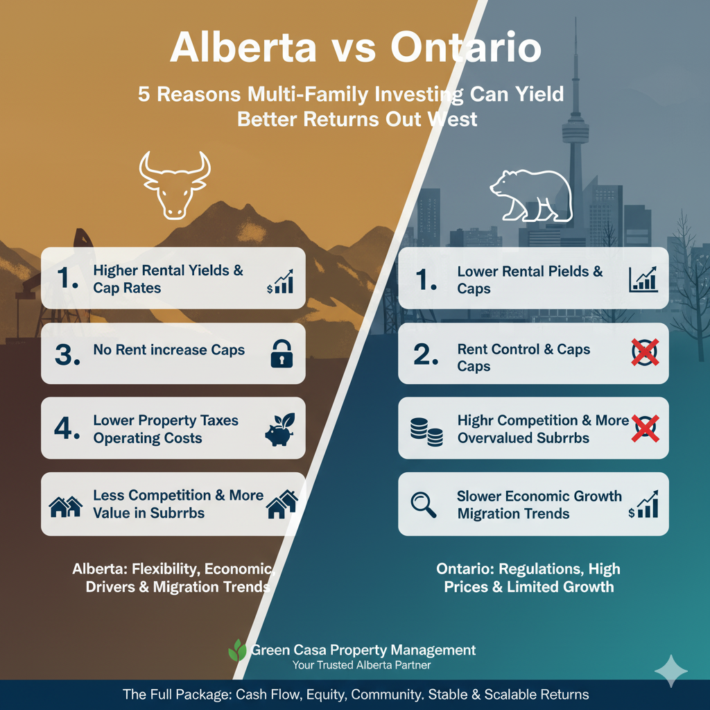 - In Ontario, prime multi-family properties are often highly competed over, which pushes up purchase prices and squeezes margins. Alberta’s market has areas with strong demand but lower entry prices, especially in suburbs or towns outside major cores.