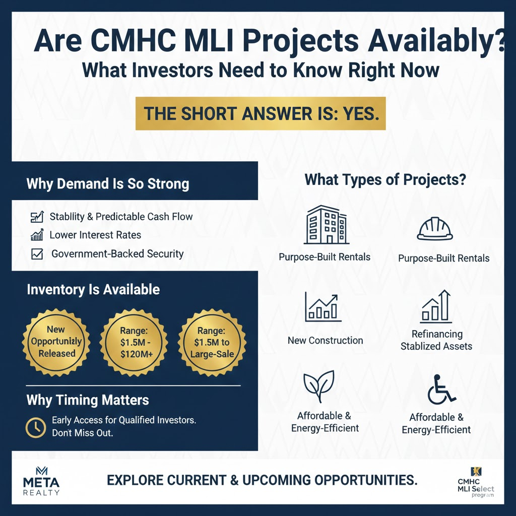 Yes, CMHC MLI Select projects are available today. Demand is high, but new inventory continues to come online to meet investor interest and housing needs.