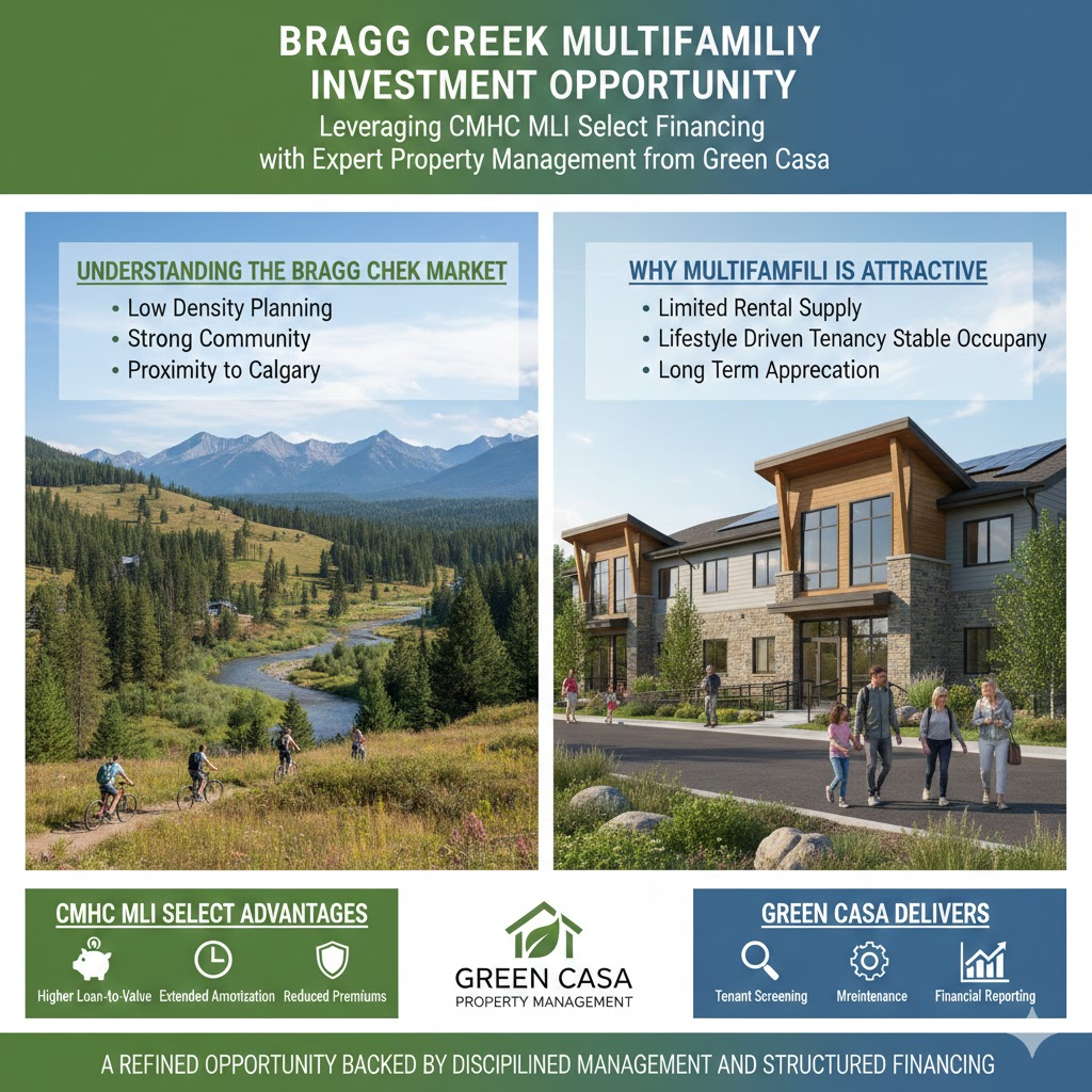 Located just west of Calgary in the foothills, Bragg Creek offers a unique blend of lifestyle appeal, controlled development, and long-term rental stability. For investors evaluating apartment investment near Calgary, this community presents a compelling opportunity, especially when combined with CMHC MLI Select financing and professional multifamily property management from Green Casa.