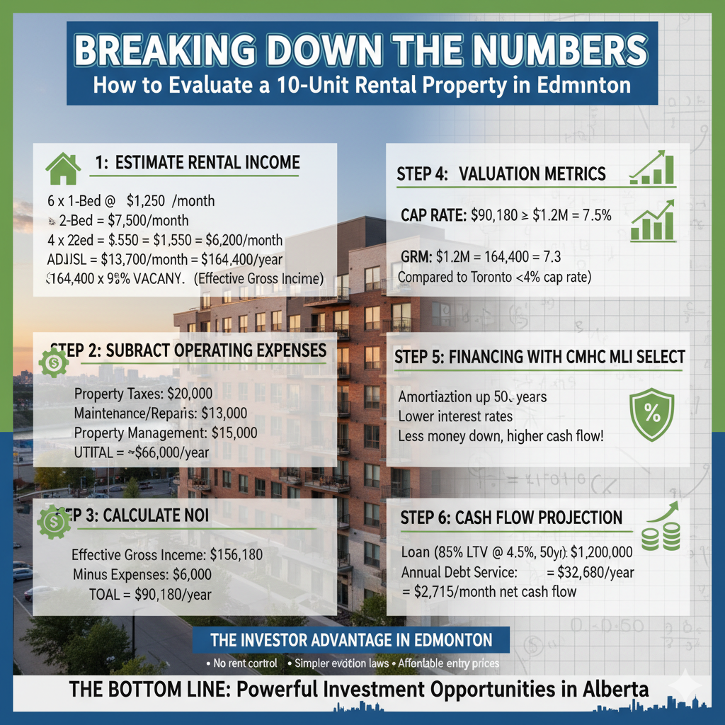 Many investors love the idea of owning multi-family properties, but struggle with the math behind evaluating them. Edmonton, with its affordable entry prices and strong rental demand, is a perfect place to learn how to analyze deals. Let’s walk through an example: a 10-unit apartment building in Edmonton.
