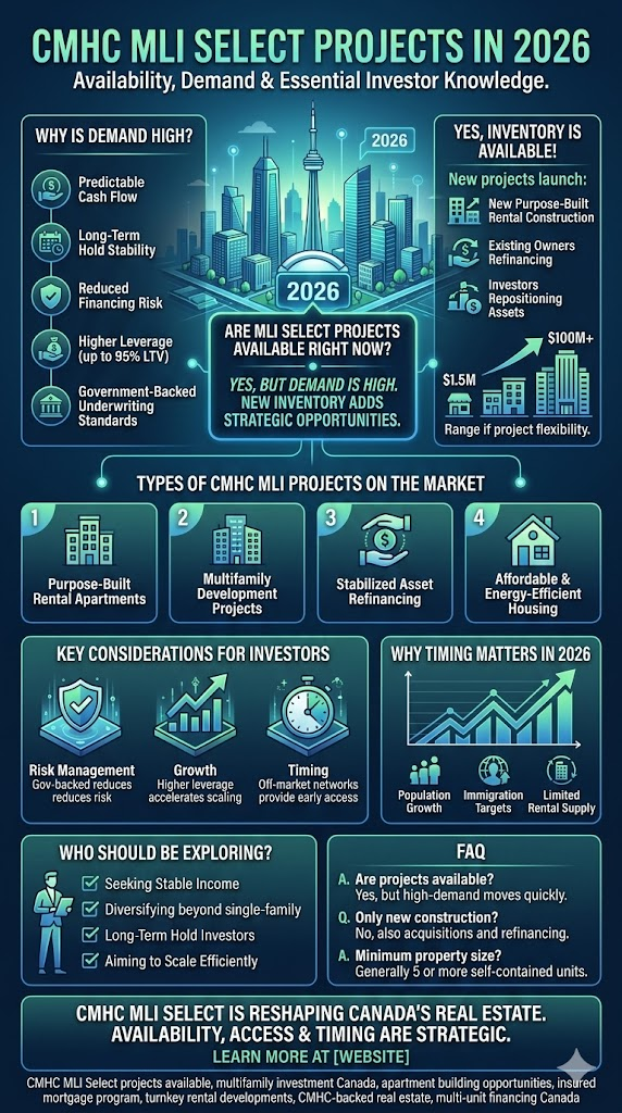 Keywords: CMHC MLI Select projects available, multifamily investment Canada, apartment building opportunities, insured mortgage program, turnkey rental developments, CMHC-backed real estate, multi-unit financing Canada