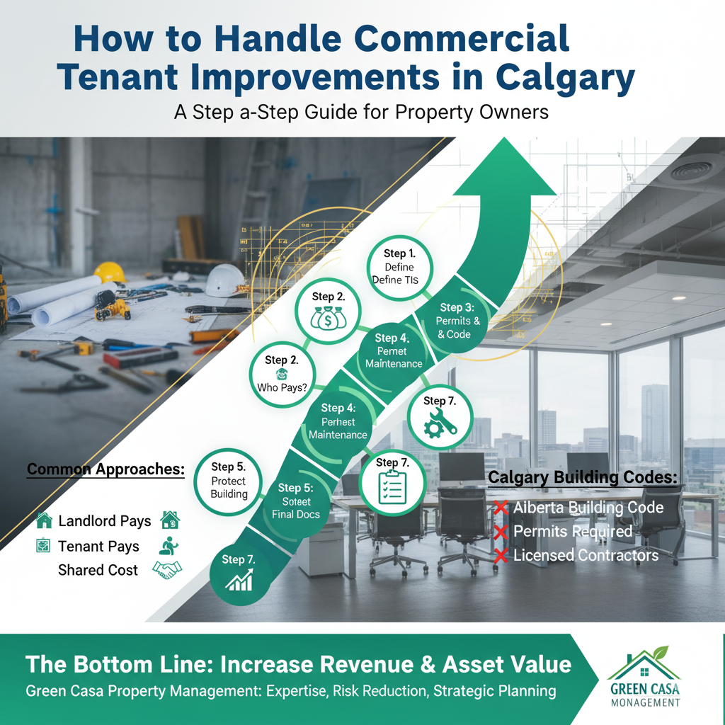 Green Casa Property Management specializes in helping Calgary commercial landlords navigate these improvements smoothly with predictable outcomes. Below is a detailed, real-world guide on how commercial tenant improvements should be handled in Calgary’s modern market.