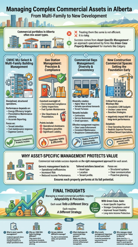 Commercial ownership across Alberta often involves a mix of asset types. A single portfolio may include multi-family buildings, gas stations, commercial bays, and newly constructed spaces, all with very different operational demands.