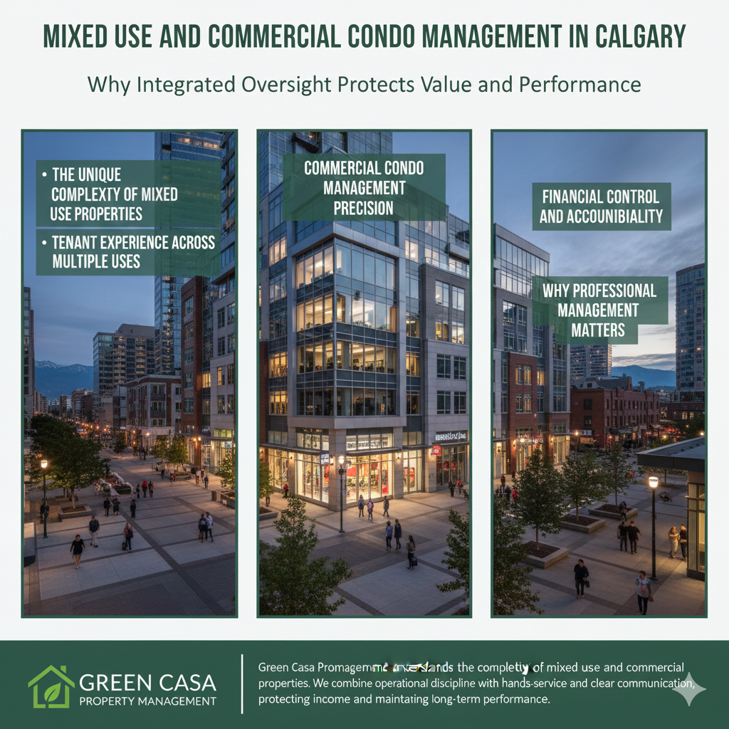 Mixed-use buildings and commercial condominiums are becoming a defining feature of Calgary’s urban landscape. These properties combine retail office, medical, and sometimes residential uses within a single development. While this structure creates opportunity, it also introduces operational complexity that requires specialized management.