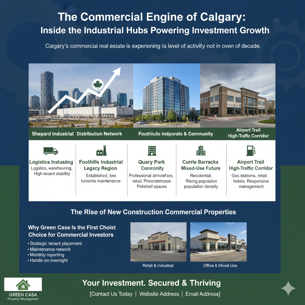 Calgary’s commercial and industrial hubs are thriving. Shepard Industrial, Foothills Industrial Estate, Quarry Park, Currie Barracks, and Airport Trail each offer high potential for long-term, stable returns. Combined with the rise of new build commercial plazas, investors have more options than ever. With Green Casa as the dedicated management and leasing partner, commercial owners can invest confidently, knowing their properties are being professionally and effectively managed.
