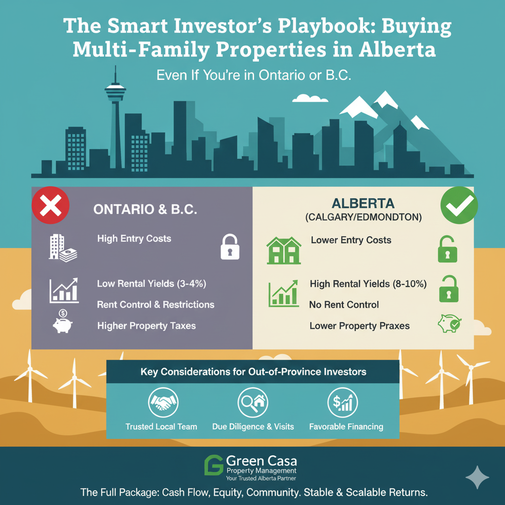 Thinking about investing in multi-family real estate but tired of sky-high prices in Ontario or B.C.? Alberta, especially cities like Calgary and Edmonton, is increasingly becoming the smart destination. Lower entry costs, landlord-friendly laws, strong population growth, and higher rental yields all add up. If you’re a real investor from another province, here’s your guide to doing it right with Green Casa’s support.