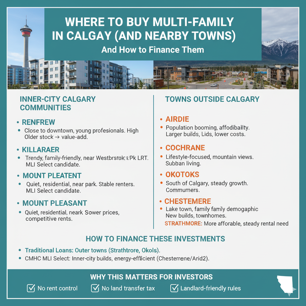 If you’re new to multi-family investing, the first big question is where to buy. Calgary has no shortage of strong rental markets, but opportunities also extend beyond city limits, into fast-growing towns that are pulling in renters priced out of the city. Let’s break down the most promising communities for your first apartment building investment.